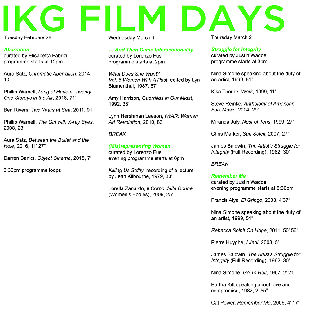 This initiative reflects the intention of periodically activating the galleries by means of activities other than the static exhibition format. Similarly to IKG LIVE (a festival dedicated to performance, live and time-based art) and our rolling programme of public events and workshops, IKG FILM DAYS intends to explore other ways of using our exhibition spaces so as to engage different practitioners and speak to diverse audiences. Elisabetta Fabrizi and Justin Waddell are the two Guest Curators who have conceived alongside Lorenzo Fusi (Visiting Academic Curator at the IKG) the programmes for this edition of FILM DAYS.