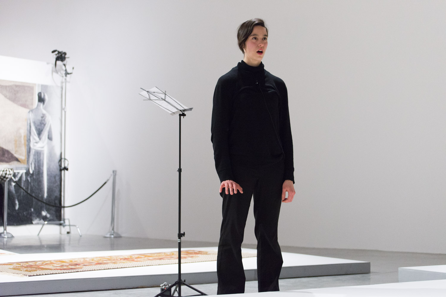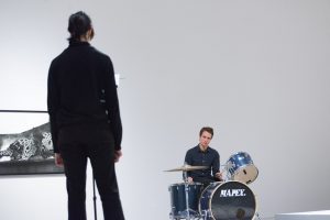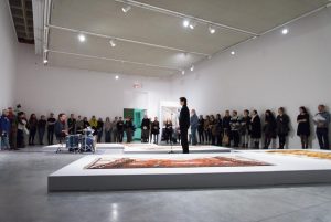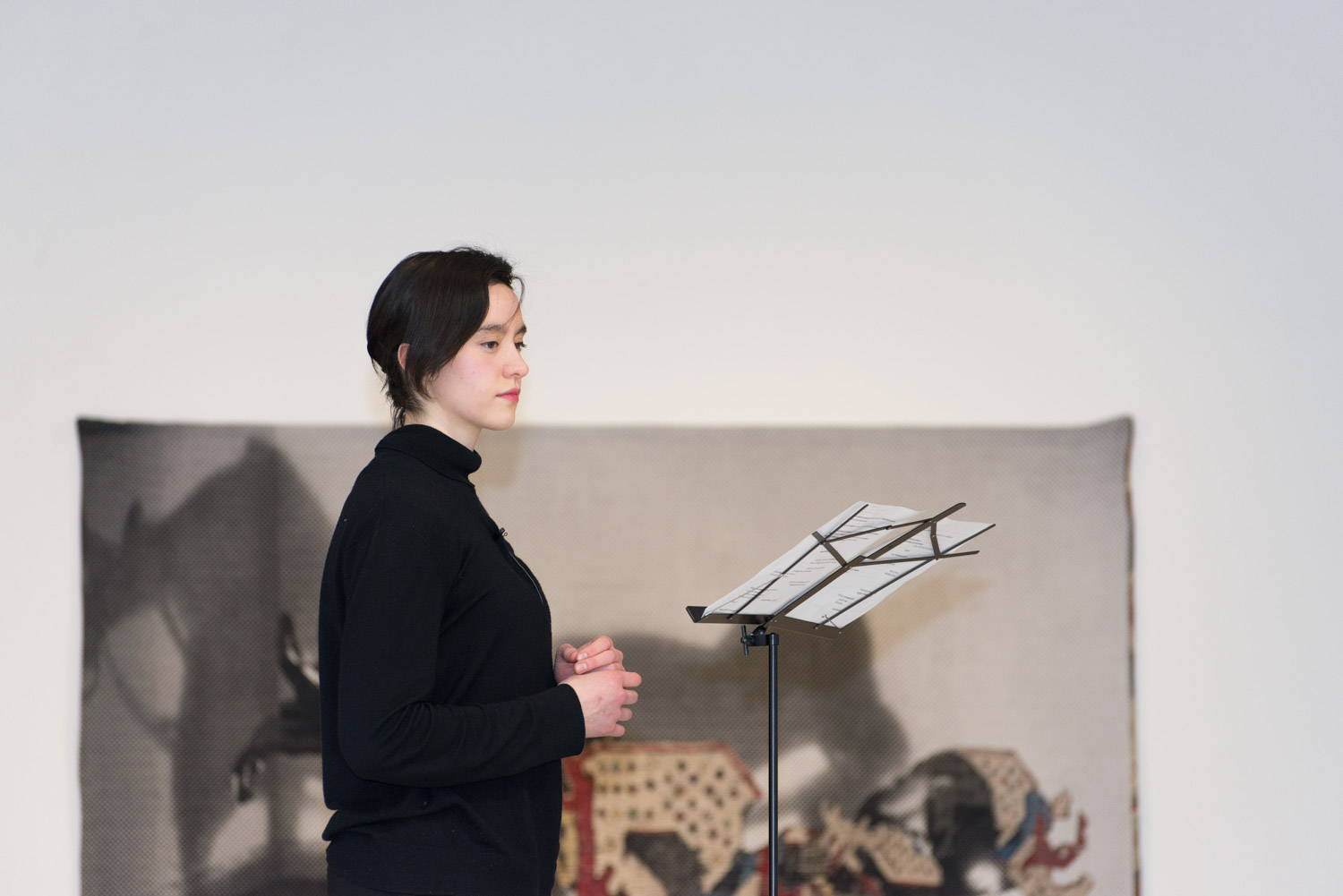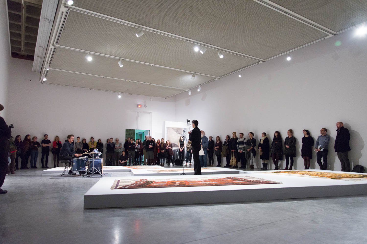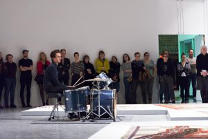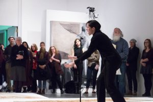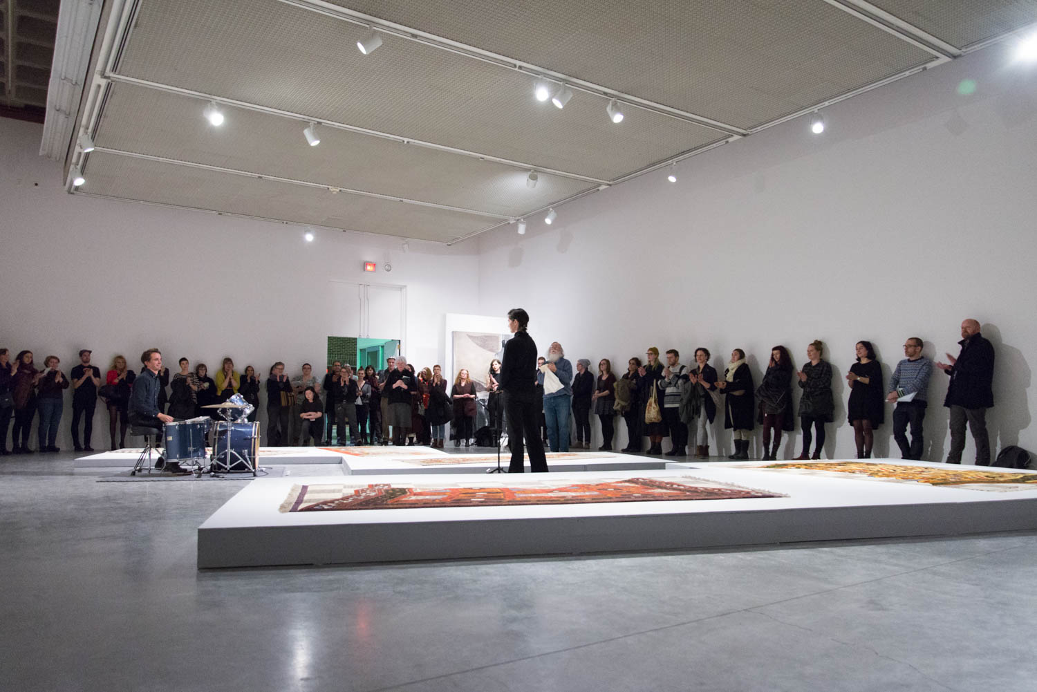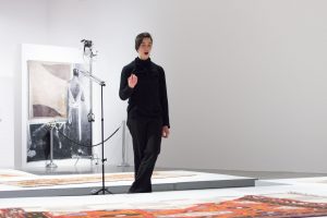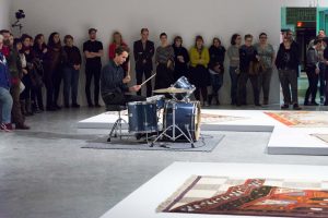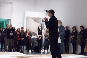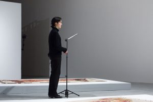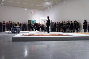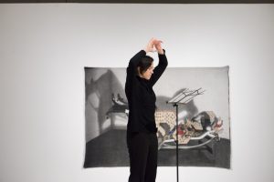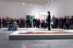KHAAREJ No.2 is a performance, which shares similar methodologies and approaches of translation and cultural re-appropriation with Shannon Bool’s Eastern Carpet in the Western World. The piece is based on a poem written by Sahar Te, using mostly English words that have been appropriated by Farsi, performed by English speaking performers while the Farsi words are scratched out of the poem.